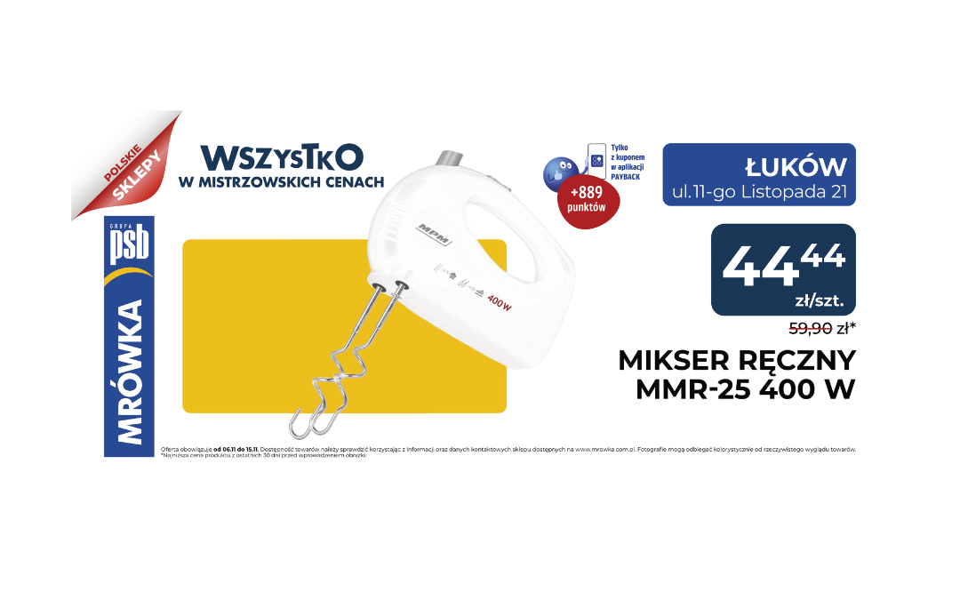 👉 Odwiedź Mrówkę w Łukowie i wybierz mikser ręczny MMR-25 400 W MPM – bo najlepsze smaki zaczynają się od doskonałego miksowania!